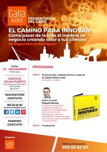 El próximo día 23 de noviembre tendrá lugar en Galia Puerto la presentación del libro “El Camino para Innovar. Cómo pasar de la idea al modelo de negocio creando valor a tus clientes”, escrito por Miguel Macías Rodríguez.