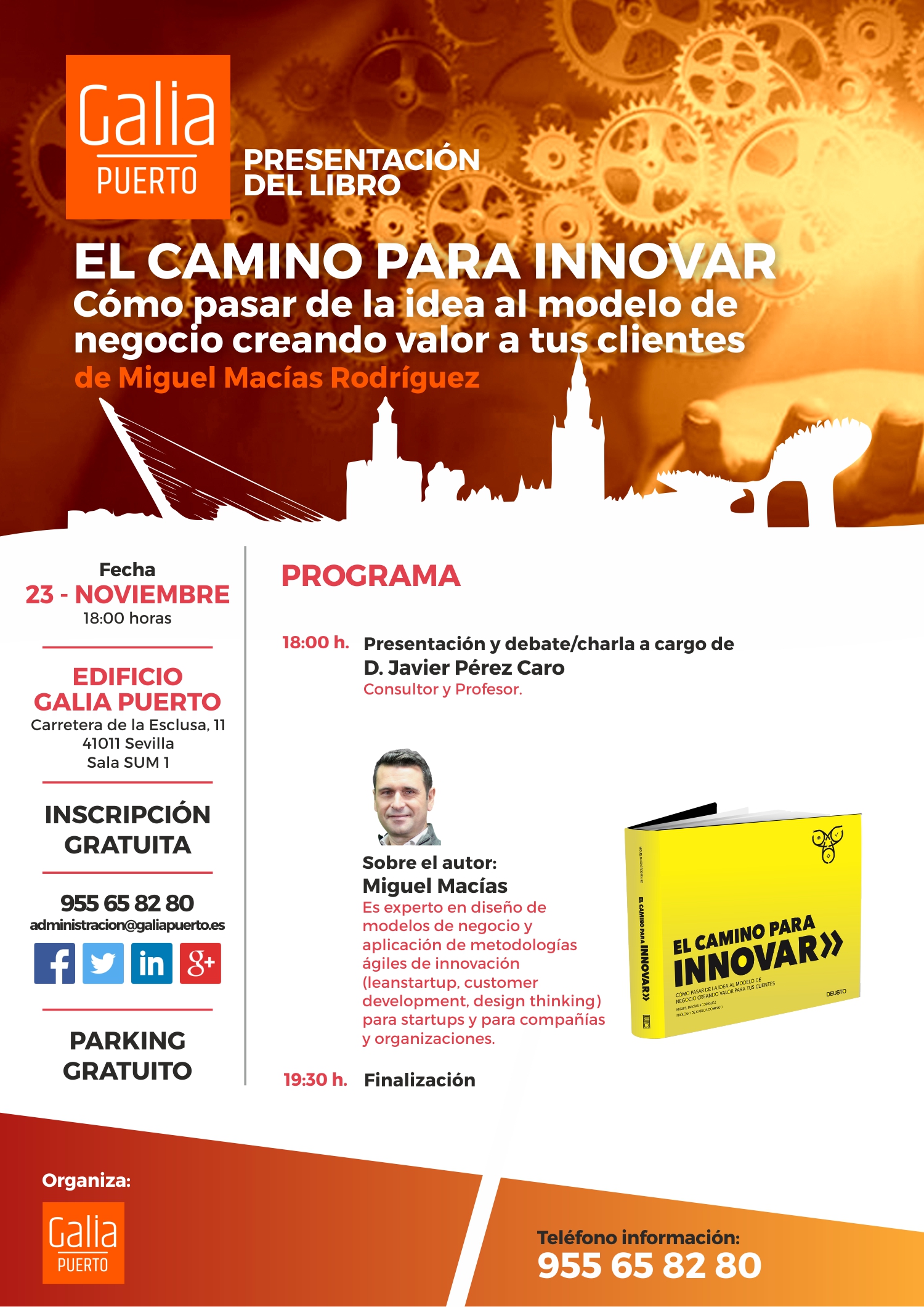 Si estás interesado en asistir a la presentación del Libro, puedes inscribirte de forma gratuita previa confirmación a través del formulario de EventBrite el correo electrónico administracion@galiapuerto.es o bien en el teléfono 955 65 82 80. También puedes descargarte el cartel del evento.